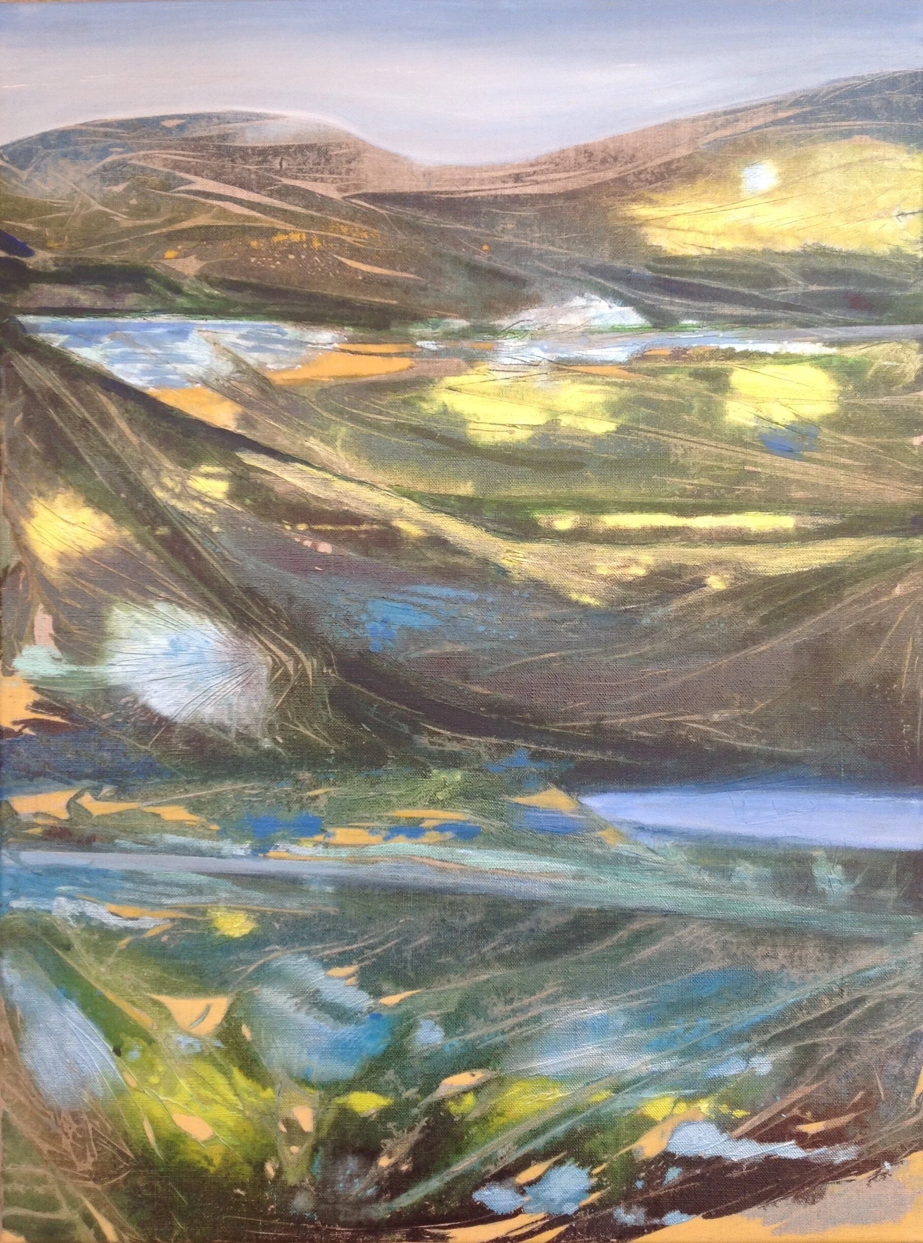 This is a painting that … painted itself! I had the idea of landscape and hills. I poured ink onto a linen canvas and let it dry. Afterwards, I spent time with it seeing what it wanted … then painted into it.