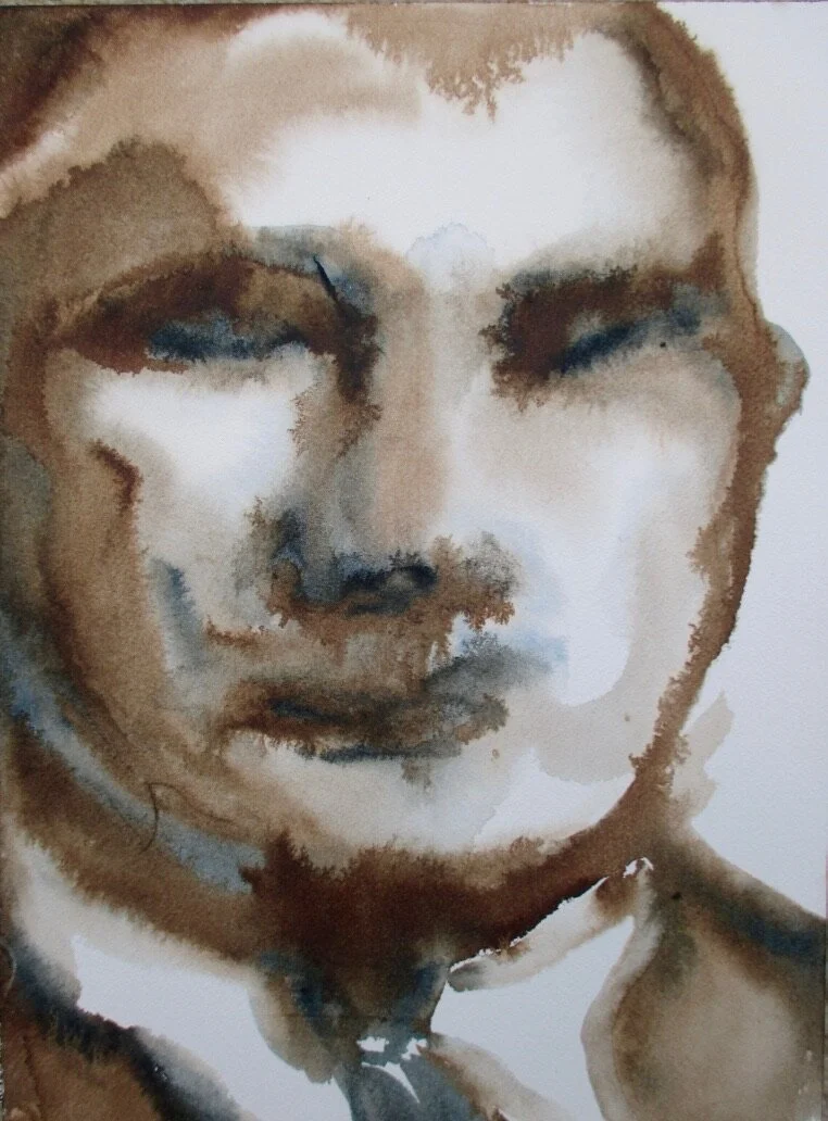 Following the "Faces" project, I started to paint larger, looser images of the faces in brown ink and indigo watercolour. I wanted to use these distorted photographs of photographs as a metaphor for fading intergenerational memory. The distortion of memory over time. The faces are fading, as if from time, and intergenerational remembering, that is, fading further with every generation. Traces of the trauma remain as does the urge to create and remember. There are also references in the installation below to Chagall's ‘White Crucifixion’ and Barnett Newman's ‘Stations of The Cross’.